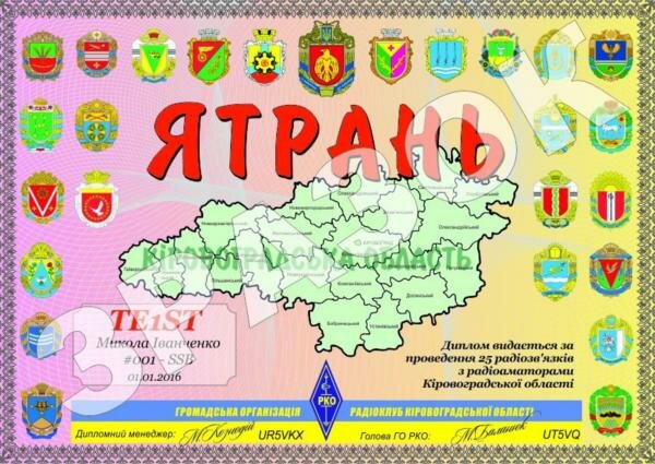1.За проведение 25 QSO на КВ с радиолюбителями Кировоградской