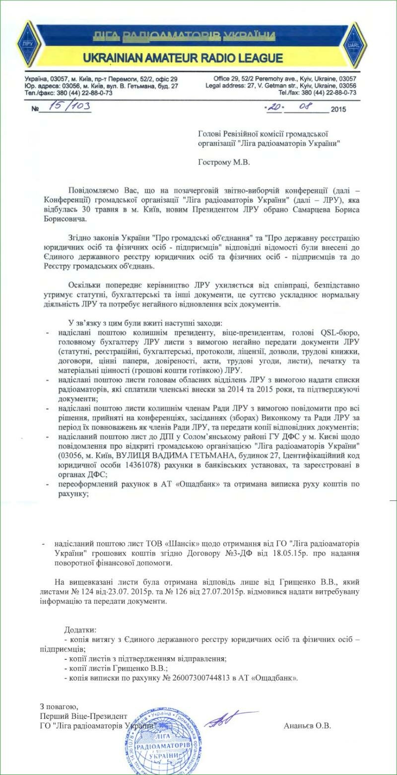 Громадська організація Ліга радіоаматорів України (ЛРУ) повідомляє, що втрачені: оригінал Статуту ЛРУ, оригінал Свідоцтва ЛРУ, печатка ЛРУ із зображенням емблеми ЛРУ, попередня емблема ЛРУ (зображенням на жовтому фоні написи UARL або ЛРУ та антени у вигляді Герба України ) та попередній бланк ЛРУ вважати не дійсними.