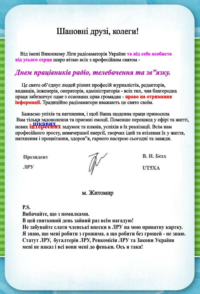 P.S. змушений константувати той факт, що збори не підтримали звернень "товарисча" Гуебенко UY0ZG та соплеменників UT5XA UT0FT, і не ставили питання про звільнення І. Доскоча від виконання обовязків голови ЛКК ( ЛОВ ЛРУ).