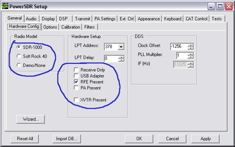 После этого можно инсталлировать PowerSDR. В большинстве случаев для 1 Вт трансивера или SDR приёмника, в процессе установки, во всех окнах можно жать "ОК". Конечно, если используется SDR-1000 c 100 Вт усилителем, трансвертером DEMI144 и т.д, в соответствующих разделах это следует указать. Как только программа запустилась, не спешите её сразу включать клавишей Standby. Необходимо сделать предварительные настройки в Setup`e. На данном этапе важна закладка: Hardware Config в разделе General.