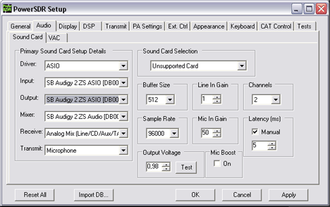 В разделе Audio->Sound Card необходимо выбрать звуковую карту которая будет использоваться PowerSDR. В меню Sound Card Selection перечислены поддерживаемые звуковые карты. Если Вашей карты нет в списке, следует выбрать Unsupported Card. Правильность установки входов/выходов проверьте в соответствующих окнах. Sample Rate по умолчанию выбран 48000 Гц, если карта может работать с большими значениями, выберите. Для неподдерживаемых карт доступны все режимы Sample Rate, но будет ли карта с ними работать, проверьте экспериментально. С большими значениями Sample Rate выше скорость обработки сигнала, шире диапазон панорамы и программной перестройки (для приёмников).
