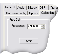 Калибровку трансивера и программы PowerSDR следует начинать с калибровки частоты Freq Cal. Лучше всего использовать внешний генератор, но можно ориентироваться и на сигналы эталонов времени и частоты (например 4996 кГц, 9996 кГц, 14996 кГц - каждые 30 мин. сигнал несущей). Для автоматической калибровки необходимо минимальное соотношение сигнал/шум 30 дБ. Нужно указать значение эталонной частоты частоты и нажать Start.