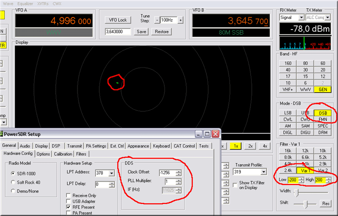 Для более точной подстройки или проверки частоты в процессе эксплуатации SDR, удобно использовать режим дисплея Phase, выбрав Mode DSB и достаточно узкий фильтр -200Гц/+200Гц, наблюдать за перемещением точки вокруг центра дисплея. В идеале точка неподвижна или совершает медленные хаотичные движения. Подстройка частоты производится значением Clock Offset.