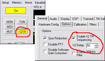 Кроме того, для коммутации усилителя мощности следует активировать функцию PTT на передней панели программы или в меню Setup`a, где так же можно выбрать время задержки.