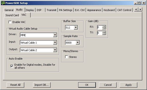 Обязательно перезапустите программу PowerSDR после изменения этих параметров! Теперь при выборе режимов работы DIGIL/DIGIU подключение VAC будет происходить автоматически.