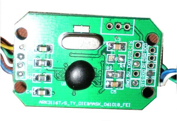 На фотографии мы видим, что место под микросхему на плате пустое, но с другой стороны платы находится микрочип залитый компаундом. Здесь все просто выхода соответствующие COM-порту промаркированы на плате и с распайкой проблем не возникнет.