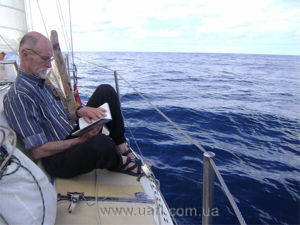 | Валерій Дейментович вивчає особливості Атлантичного повітря за допомогою наукового приладу (автомобільній пилесос), а токаж застарілою і недосконалою методою - носом | |||