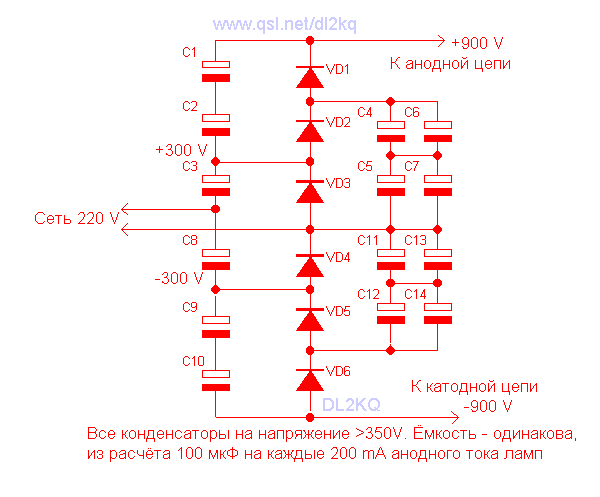 Для примера показан триод, включенный по схеме с общей сеткой, что, впрочем, совершенно не принципиально - может быть и тетрод, и пентод, и схема с общим катодом (экранное напряжение легко может быть получено стабилизатором, подключенным к средней точке выходных конденсаторов умножителя - напряжение в этой точке составляет + 600 В относительно катода).